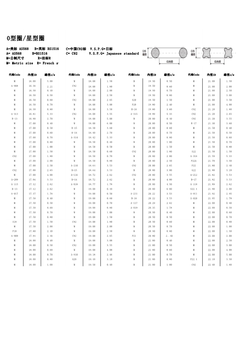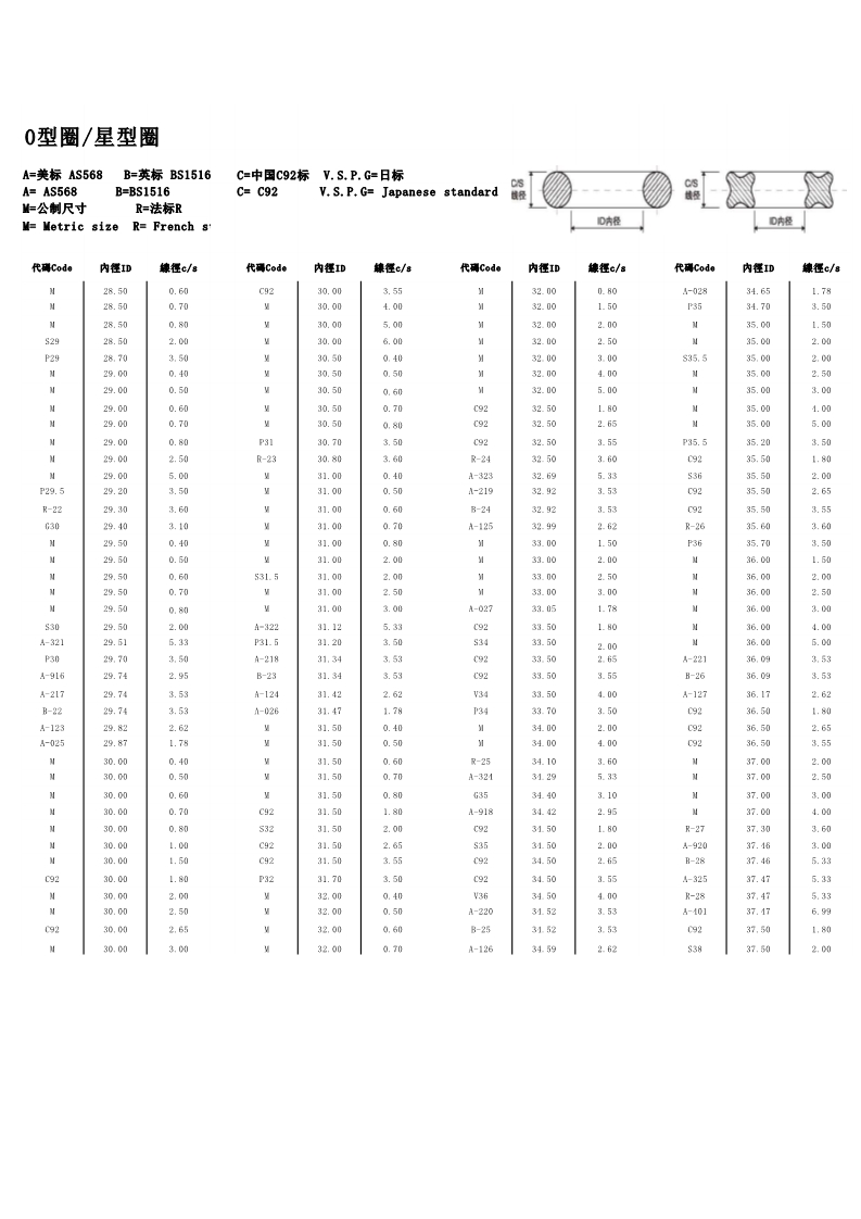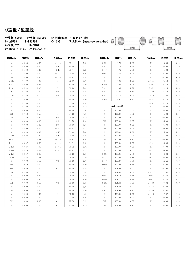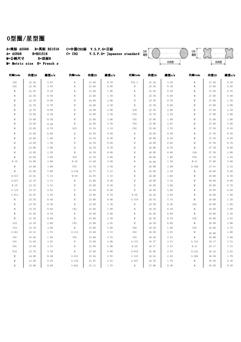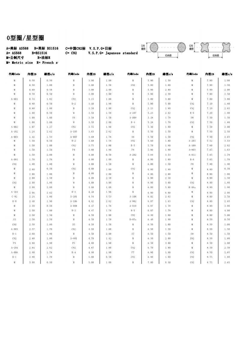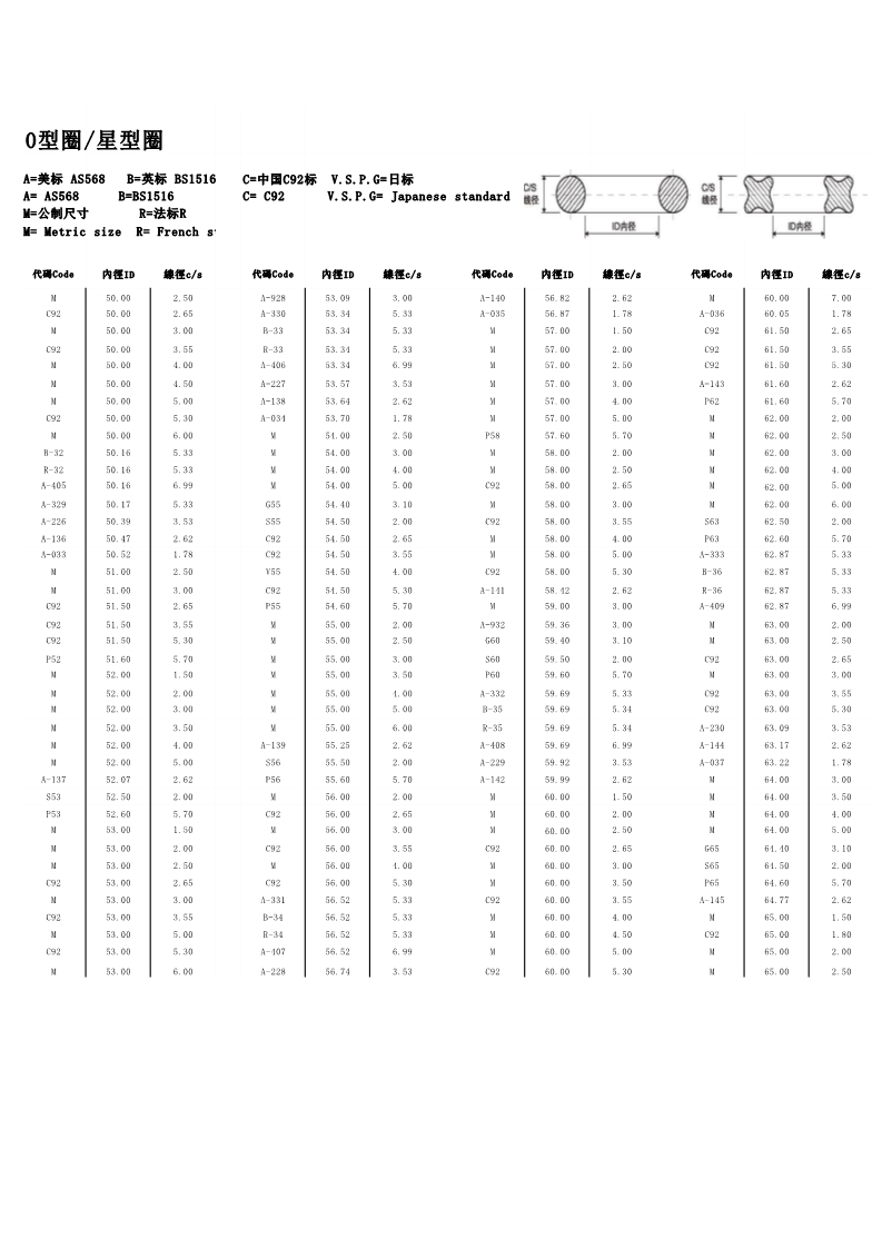 说明:O型圈规格有:美标AS568系列、日标JIS2401(G/P)系列、中标C92系列、德标DIN系列、法标R系列、英标BS系列
