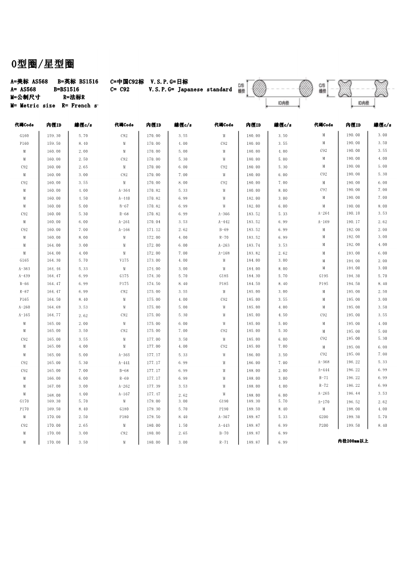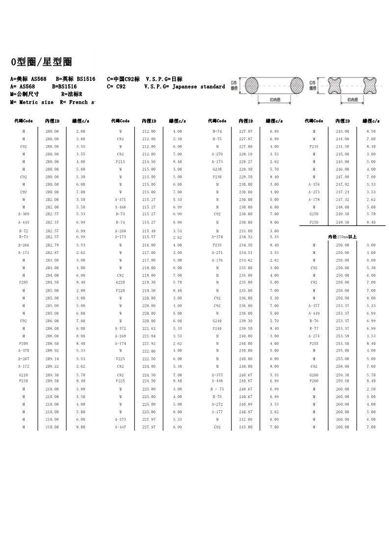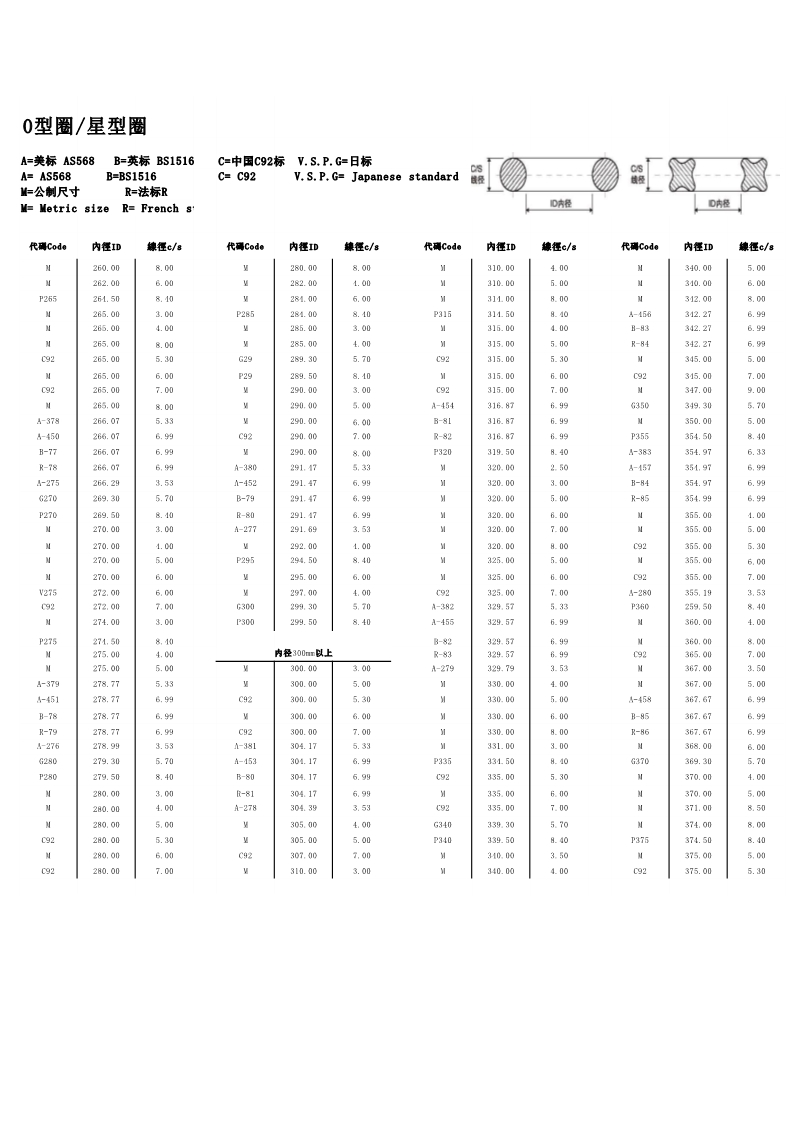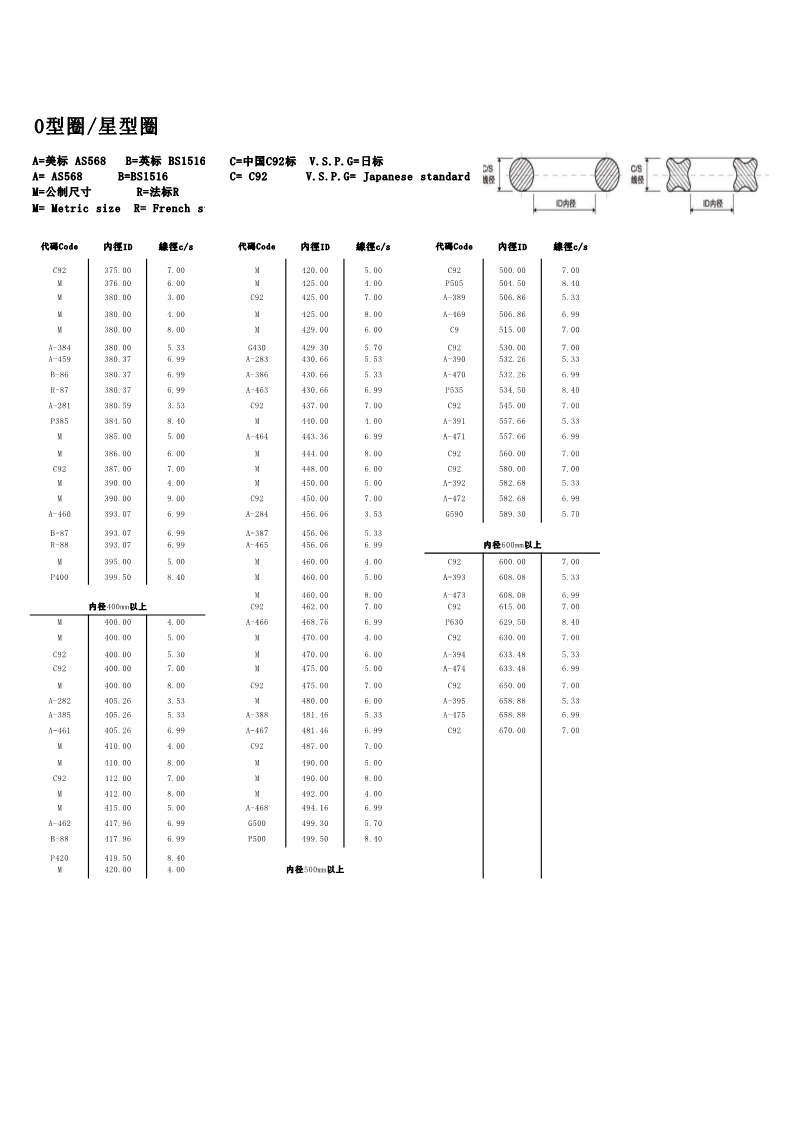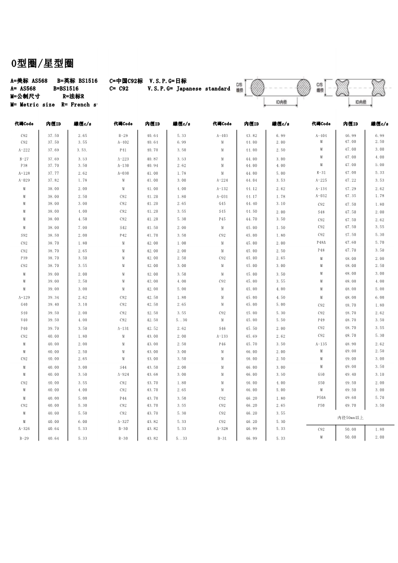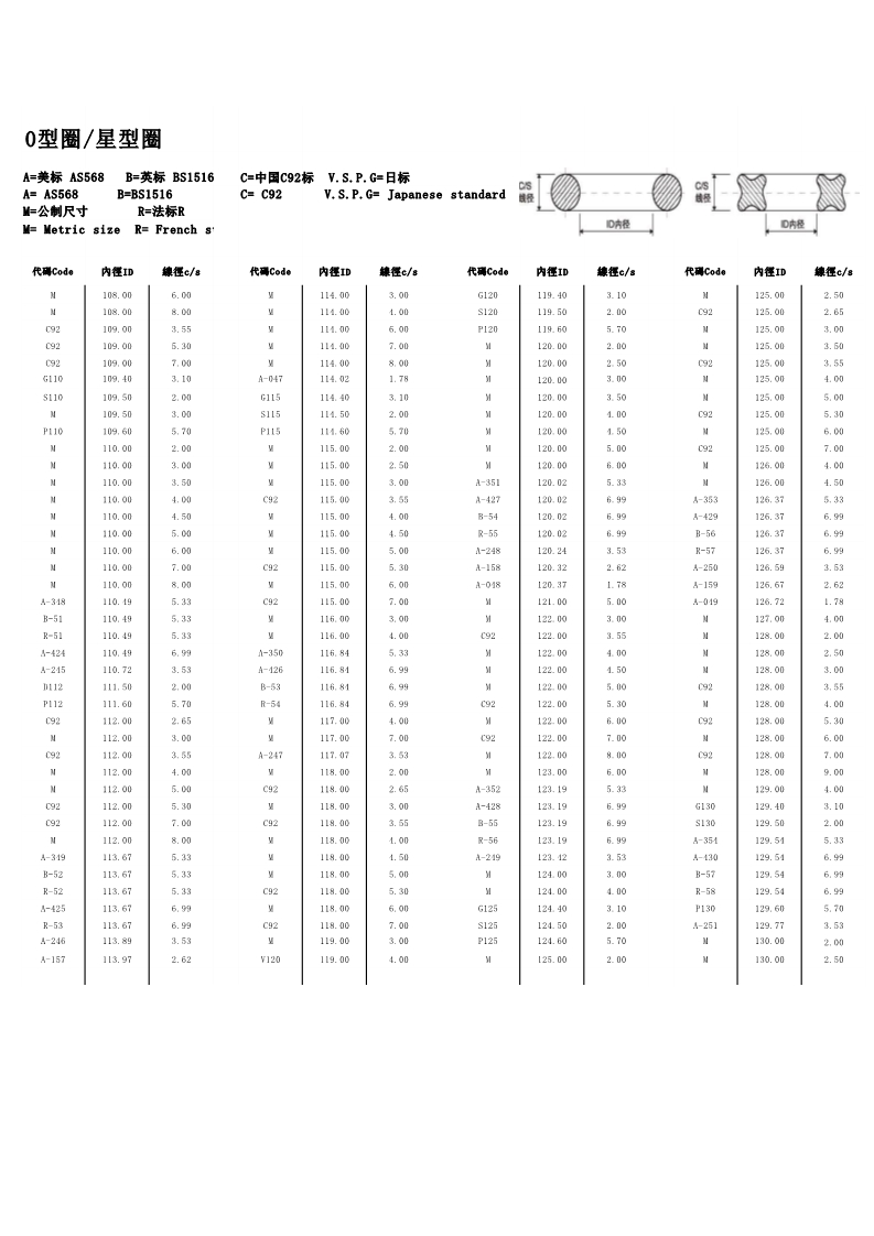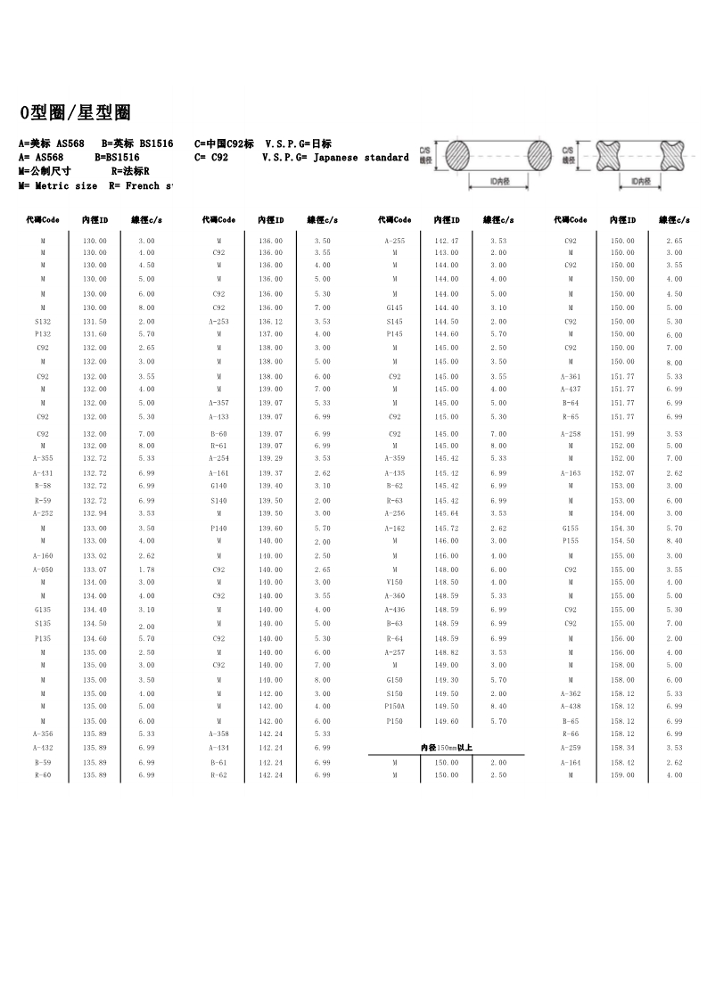 说明:O型圈规格有:美标AS568系列、日标JIS2401(G/P)系列、中标C92系列、德标DIN系列、法标R系列、英标BS系列